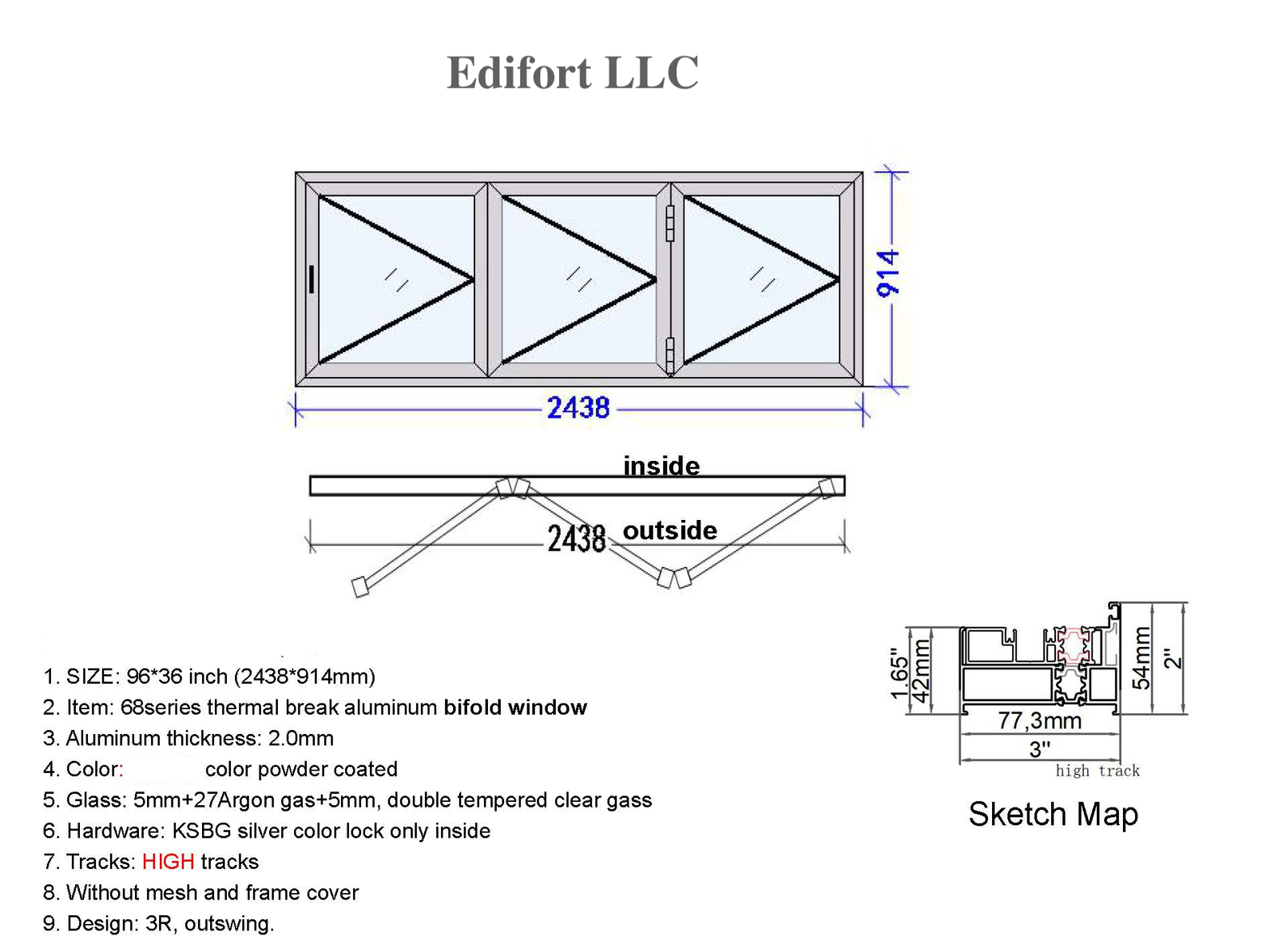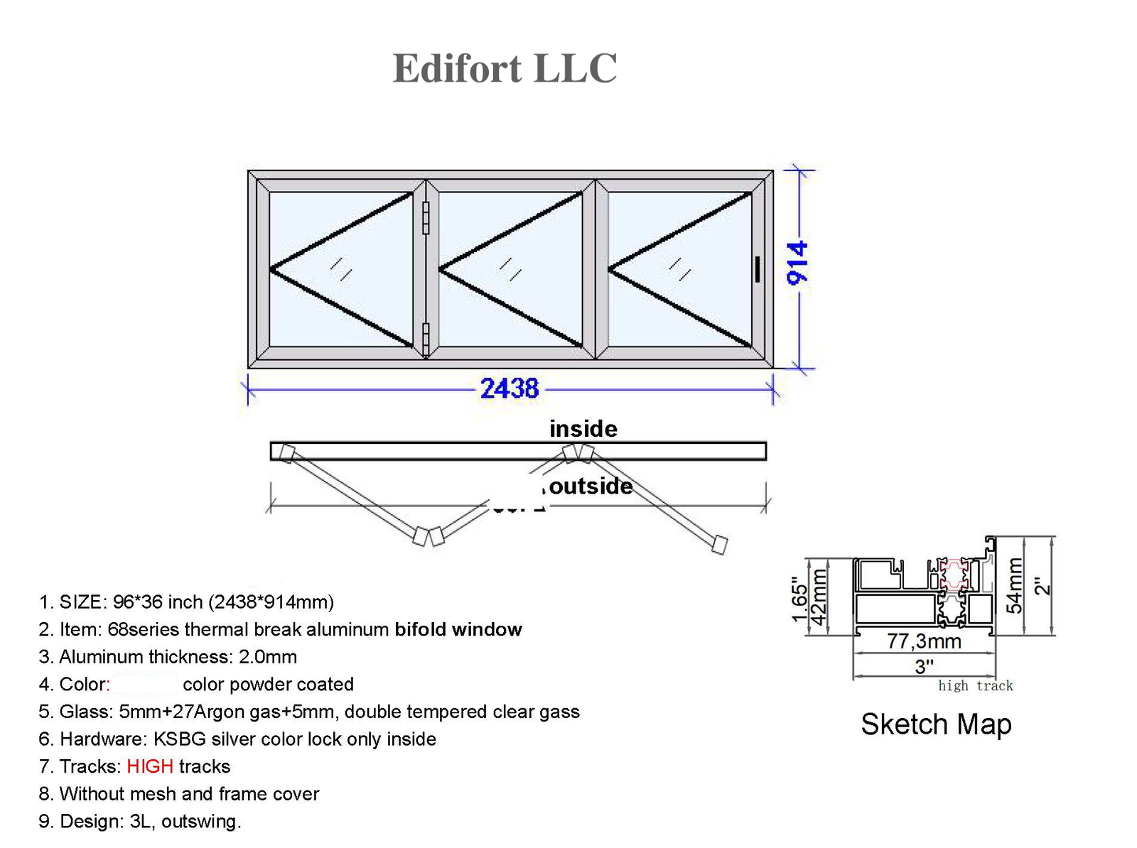Edifort – Modern Style Aluminum BiFold Window 96″Wx36″H (Horizontal Fold From Exterior View)